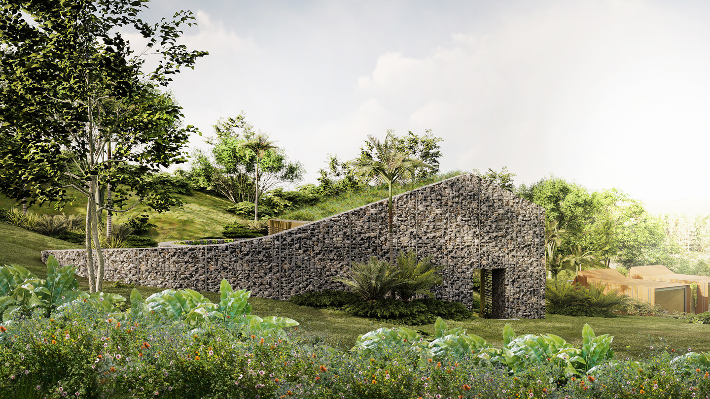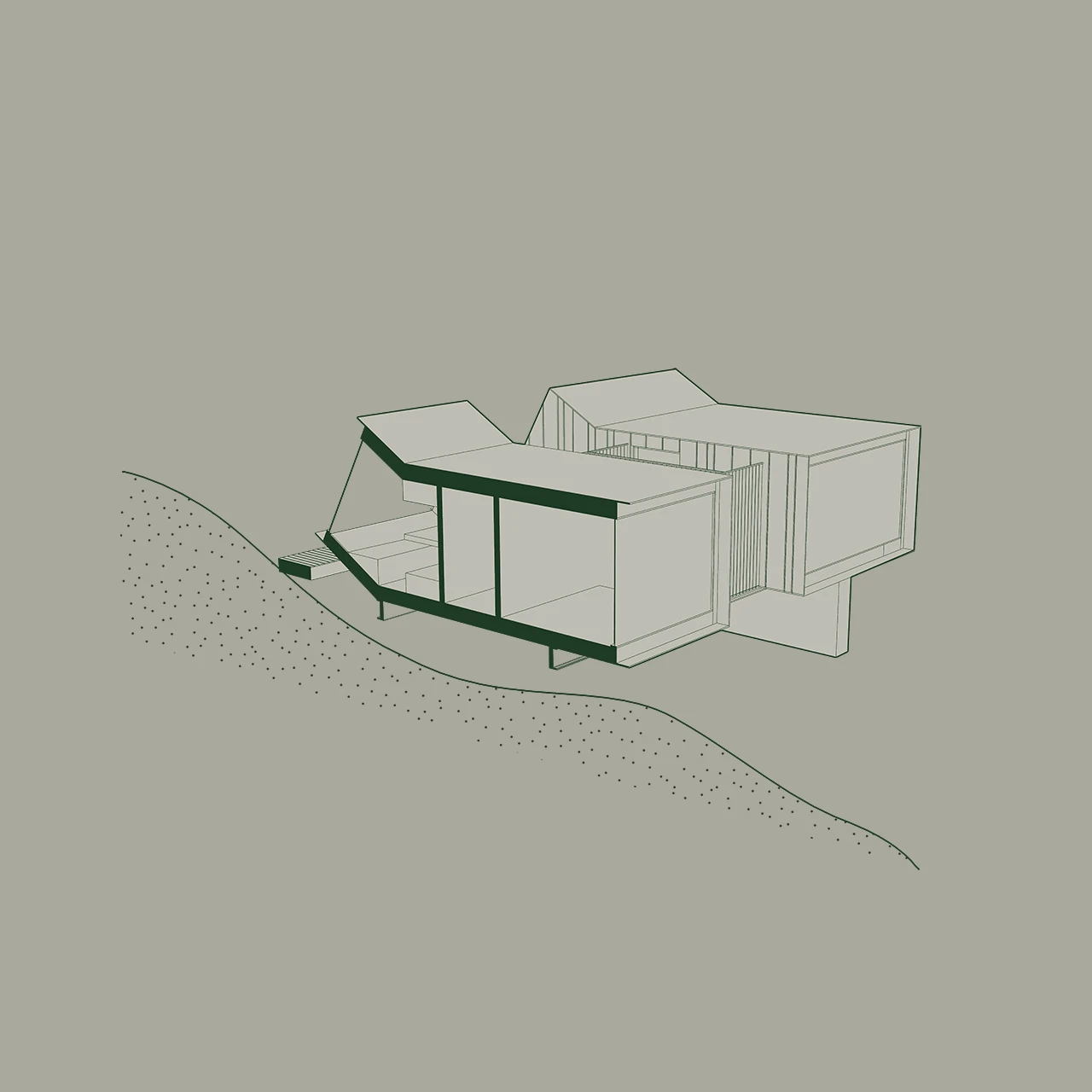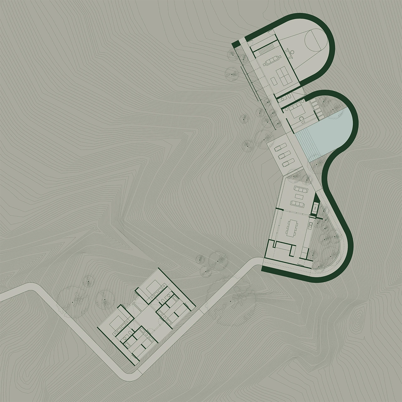 The project consists of 3 separate architectural interventions joined by a continuous walkway. Each component of the house is layered out according to how public/private it is. The first block, the ‘barn’, houses a game room, basketball court, bathroom and guest room. A pool and deck area acts as a link between the barn and the kitchen/dining/living room. Two curved gabion walls enclose both blocks giving continuity to individual spaces and containing the soil above them. A separate block located in a lower part of the property holds two mirrored modules. Each one houses 2 bedrooms and a bathroom and accommodates up to 7 people. All blocks are positioned according to views, solar orientation and topography.
