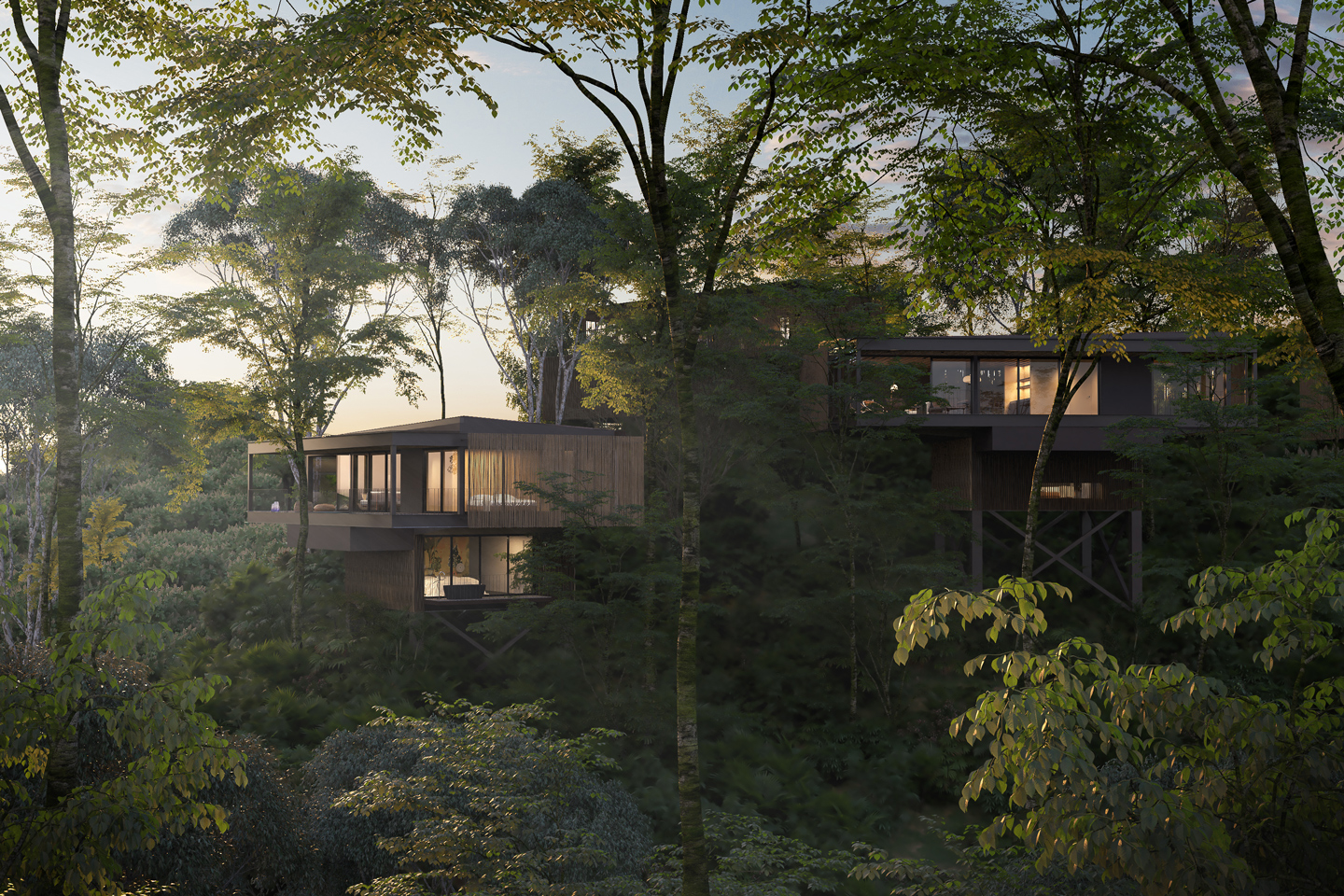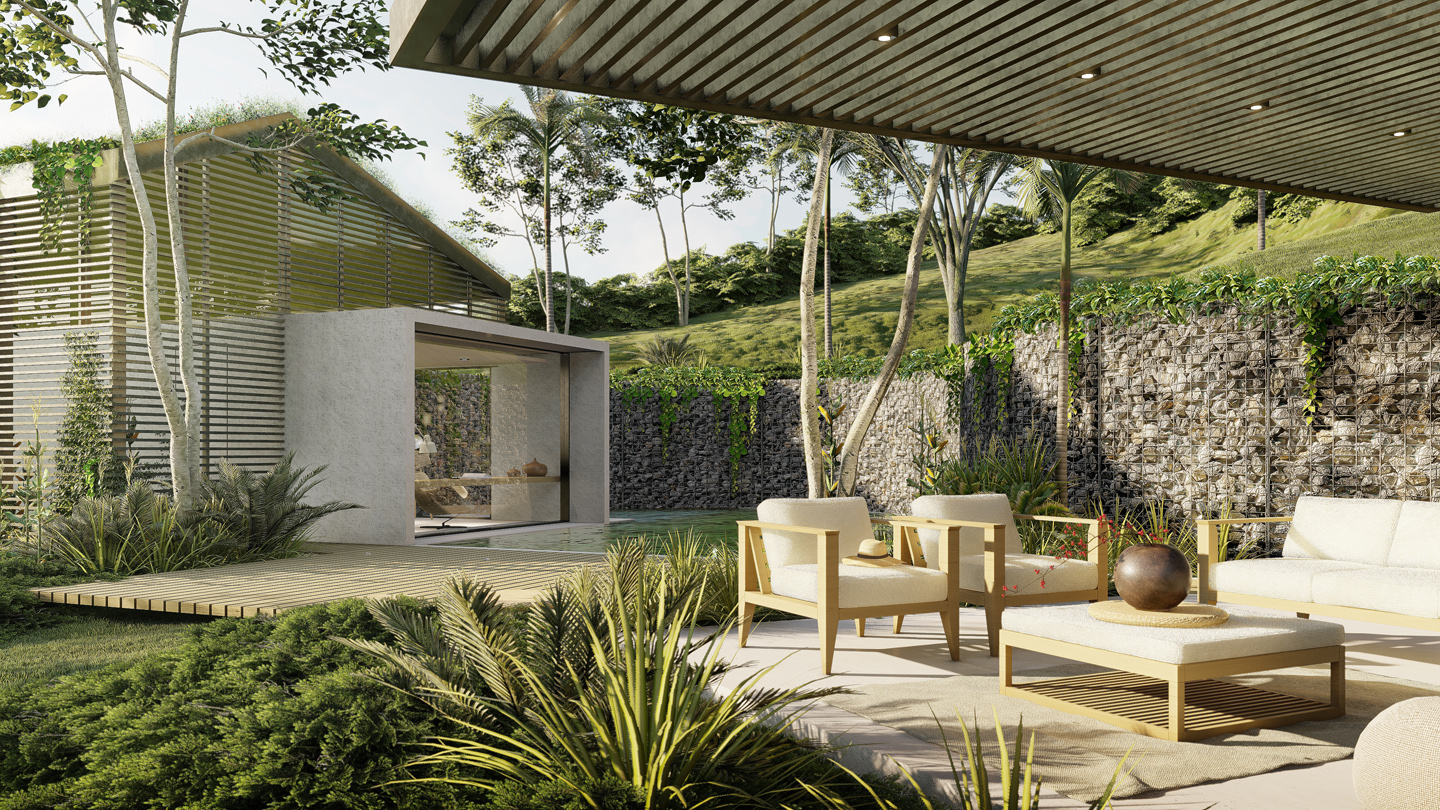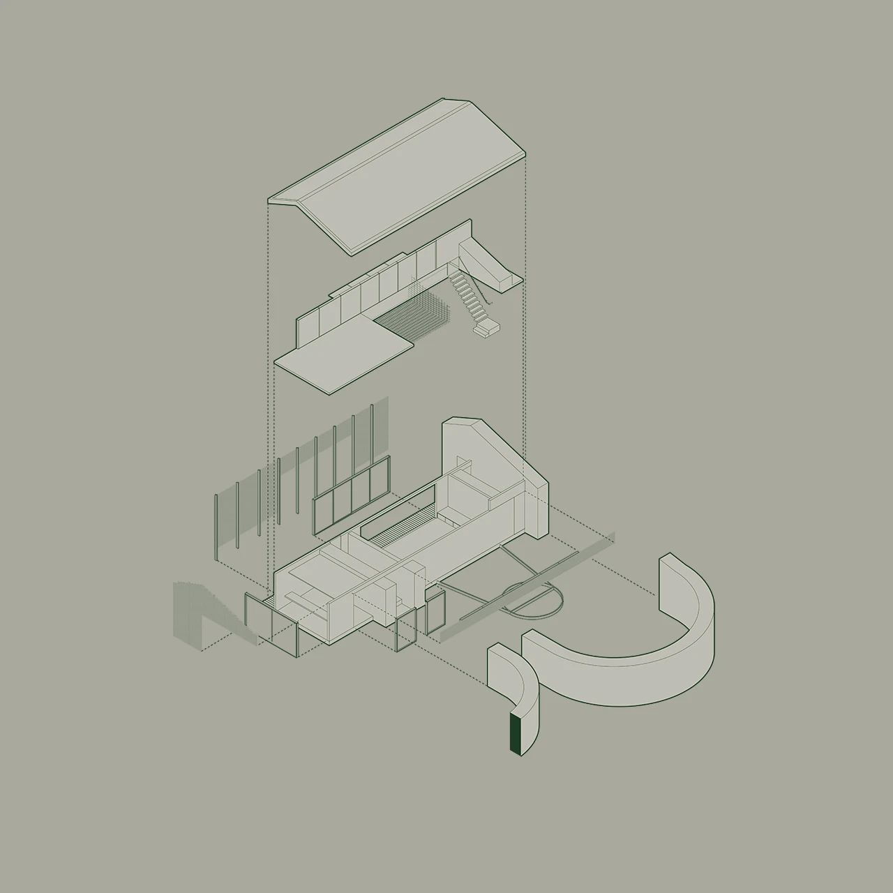 The project consists of 3 separate architectural interventions joined by a continuous walkway. Each component of the house is layered out according to how public/private it is. The first block, the ‘barn’, houses a game room, basketball court, bathroom and guest room. A pool and deck area acts as a link between the barn and the kitchen/dining/living room. Two curved gabion walls enclose both blocks giving continuity to individual spaces and containing the soil above them. A separate block located in a lower part of the property holds two mirrored modules. Each one houses 2 bedrooms and a bathroom and accommodates up to 7 people. All blocks are positioned according to views, solar orientation and topography.