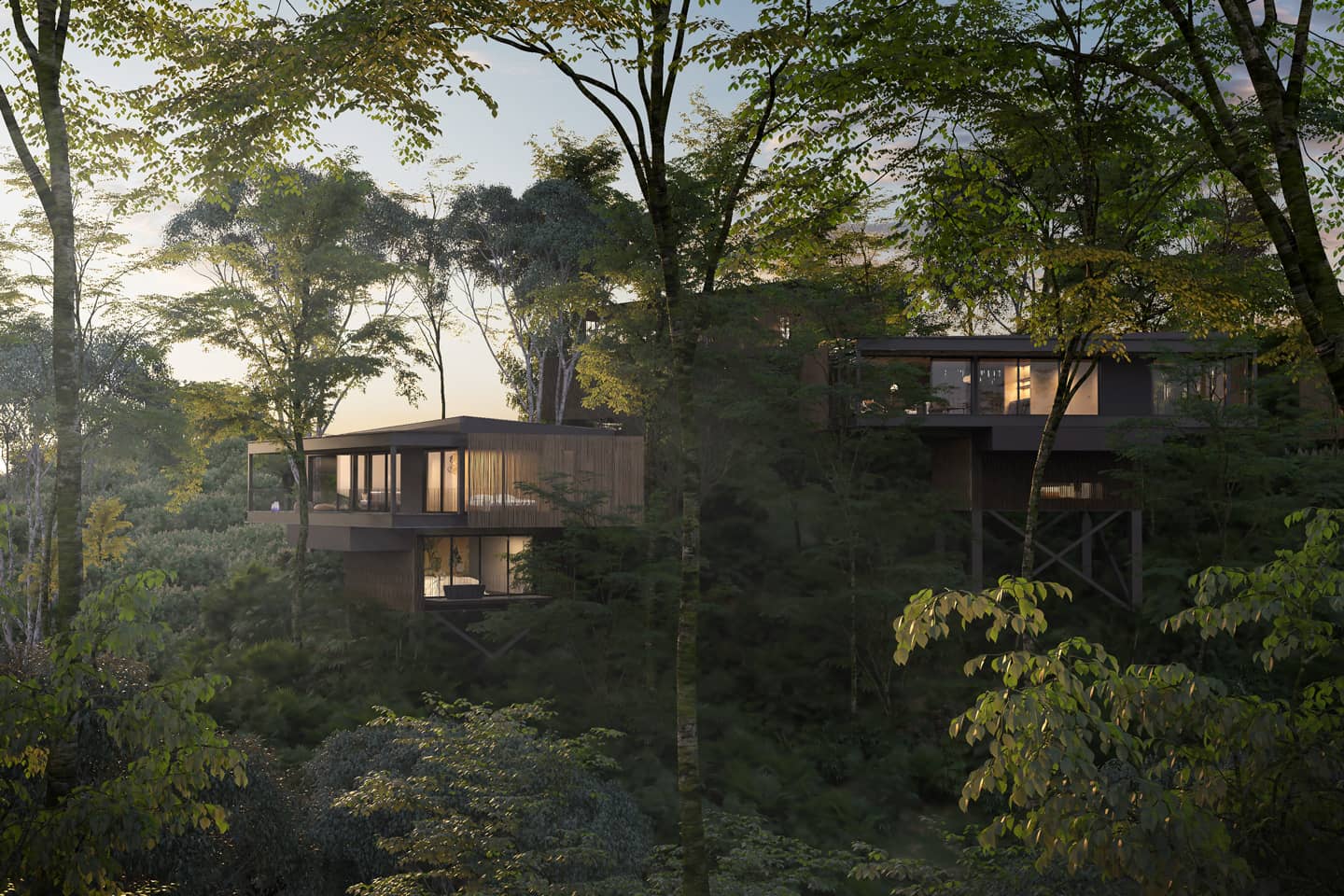 Conceived as a dwelling suspended among the treetops, Treetops is an immersive experience where architecture and nature merge into a single gesture. Its pure-lined volumes float above the vegetation, dissolving the boundaries between inside and out to offer a serene, elevated way of living directly rooted in the landscape.